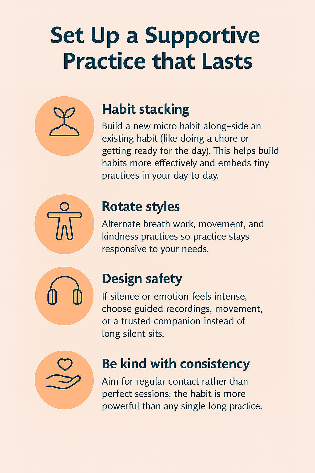 “My mind races” — Use structure: breath counts, a short mantra, or guided audio.